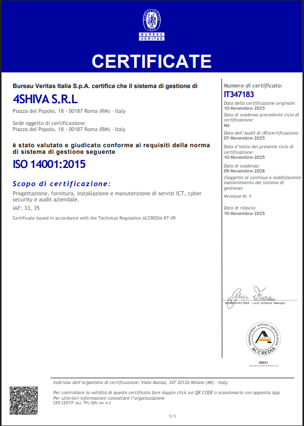 ► 4SHIVA SRL è certificata ISO 14001:2015 per il proprio sistema di gestione ambientale, a supporto di un modello sostenibile orientato alla riduzione degli impatti e al miglioramento continuo delle prestazioni ambientali.