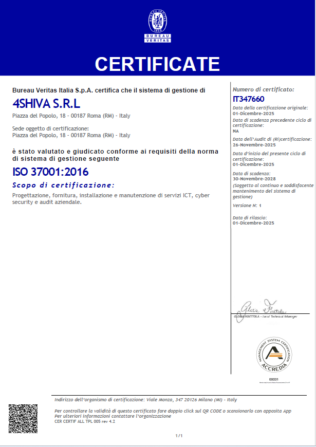 ► 4SHIVA SRL è certificata ISO 37001:2016 per il sistema di gestione per la prevenzione della corruzione, adottando misure organizzative e di controllo a tutela dell’etica e della trasparenza aziendale.